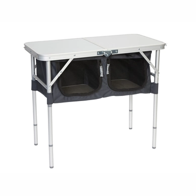 Le meuble de rangement pour table d’appoint Bo-Camp est un meuble de rangement compact et une table en un avec les dimensions 80x40x68 cm. Sous la table, il y a deux compartiments verrouillables en polyester 600 deniers. Les pieds sont réglables en trois hauteurs différentes: 31, 55 et 68 cm. Le plateau divisible garantit que la table peut être pliée de manière très compacte dans un modèle de valise et peut être facilement stockée et emportée.