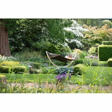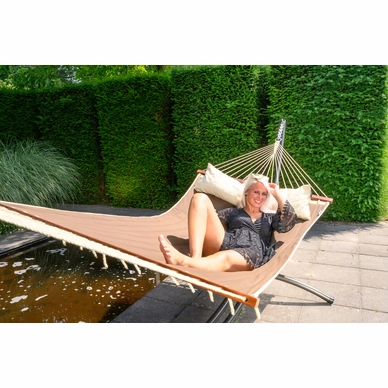 Ce superbe hamac est issu de la série Double American de Tropilex. Le hamac est composé à 100 % de polycoton, une combinaison spéciale de coton et de polyester avec un tissage épais. Cela rend le hamac très solide et durable, il durera donc longtemps. De plus, le tissu garantit que le hamac est doux et confortable. Le tissu peut résister à une averse légère, mais lorsque le hamac n’est pas utilisé, il est recommandé de le ranger dans un endroit sec. Le hamac peut soutenir un poids maximum de 180 kg et convient à un maximum de deux personnes. Le hamac a une belle grande surface de 210 x 120 cm, dans laquelle vous pourrez vous détendre agréablement. Enfin, ce hamac est fourni sans support ni kit de montage.