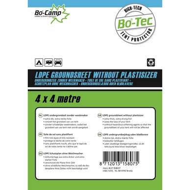 Couverture de sol extra forte. S’assure que le tapis de sol de la tente ne se salit pas et que l’humidité qui monte est stoppée, de sorte que tout le matériel de camping reste sec. Également utile pour couvrir quelque chose contre la pluie. Ne contient pas de plastifiants pour que le revêtement du tapis de sol ne soit pas affecté. Fabriqué en polyéthylène basse densité (LDPE) de 0,03 millimètre.